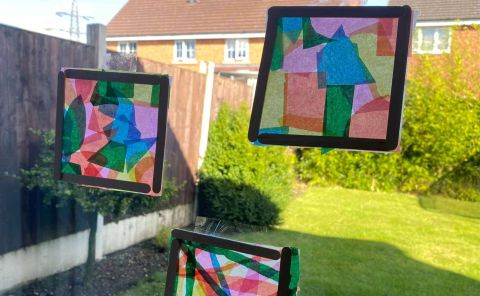 6. Wait for all the bits of glue to dry – this might take a little bit of time – then pick a place your child or young person can tape their art to the window to let the sunlight shine through it! If you have lollipop sticks, you could create a frame for the edge of their art.