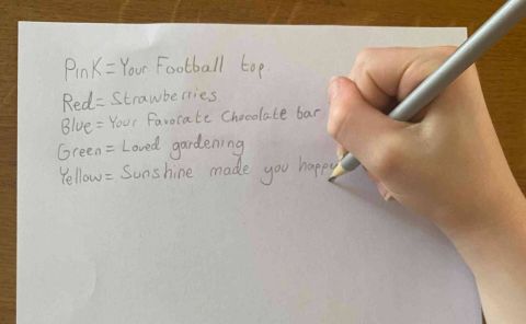 3. Take the pencil and paper and create a colour code to remind yourself of the colour choices for the piece of art. For example, Green = they loved the park.