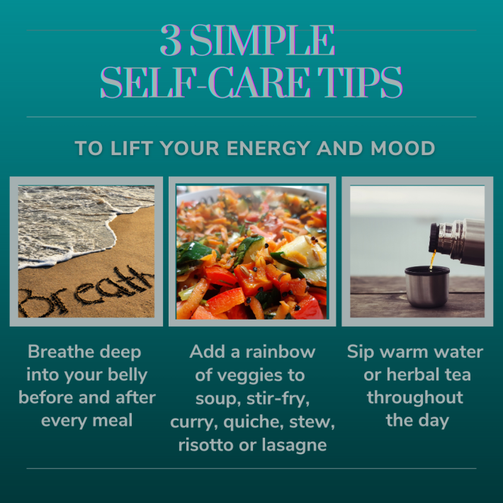 - Self care in the everyday does not need to be big nor take much time. When feeling overwhelmed, distressed, anxious – breathe slowly in through the nose and take it all the way down to the belly. It may sometimes take a few breaths to go slower. Exhale through the mouth as though you are blowing through a straw.