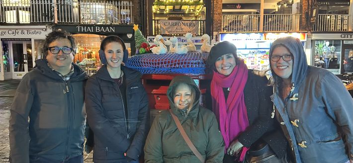 WAY Widowed and Young’s creative community have been weaving their magic once again – braving Storm Darragh to bring Christmas cheer to Chester with a fabulous yarnbomb featuring seven handcrafted swans a-swimming.